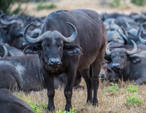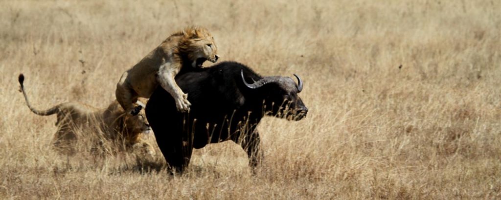 Lions are often found following large or smaller herds of buffalo, while waiting for a chance to catch and kill one. However buffaloes are not that easy to catch, due to the fact that they will not always run away, but will group together (often forming a circle around the young) and try to stand their ground in an effort to defend their young and each other. Lions are also often injured or killed by buffaloes, especially by the bulls which can cause a lot of damage with their horns as well as by stomping on the lions with their hard hooves.